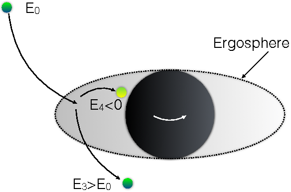 Dankzij energiebehoud weten we dat E0 = E4 + E3. Aangezien E4 bij het deeltje in de negatieve regio valt, geldt dat E4 < 0. De conclusie is zodoende dat E3 > E0. Oftewel, het deeltje dat de ergosfeer verlaat, heeft meer energie dan waar het invallende deeltje mee begon!