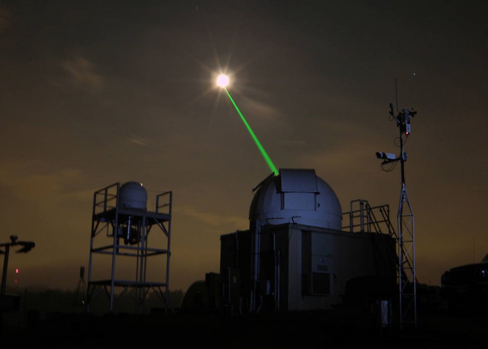 Afbeelding 2. Zo meten we de afstand naar de maan.De Laser Ranging Facility van het Goddard Space Flight Center richt een laser naar de maan. Foto: NASA/Tom Zagwodzki
