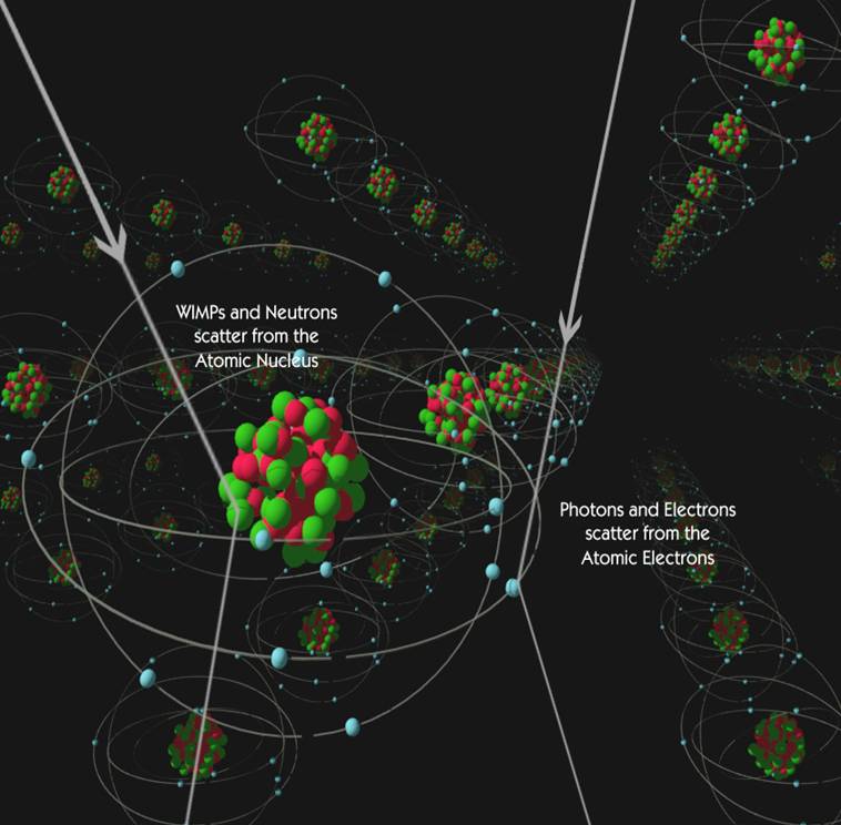 Afbeelding 2. Botsingen met xenon.Een artist impression van mogelijke interacties met een xenonatoom. Fotonen (lichtdeeltjes) en elektronen botsen (‘scatter’) met de atomaire elektronen van xenon zoals met de pijlen rechts is aangegeven. Daarentegen kan donkere materie (bijvoorbeeld WIMPs of lichte donkere materie) botsen met de atoomkern van xenon zelf (zoals links aangegeven). Doordat deze botsingen verschillen, kunnen we de twee scenario’s (linker pijlen of rechter pijlen) van elkaar onderscheiden. Afbeelding van het CDMS experiment.
